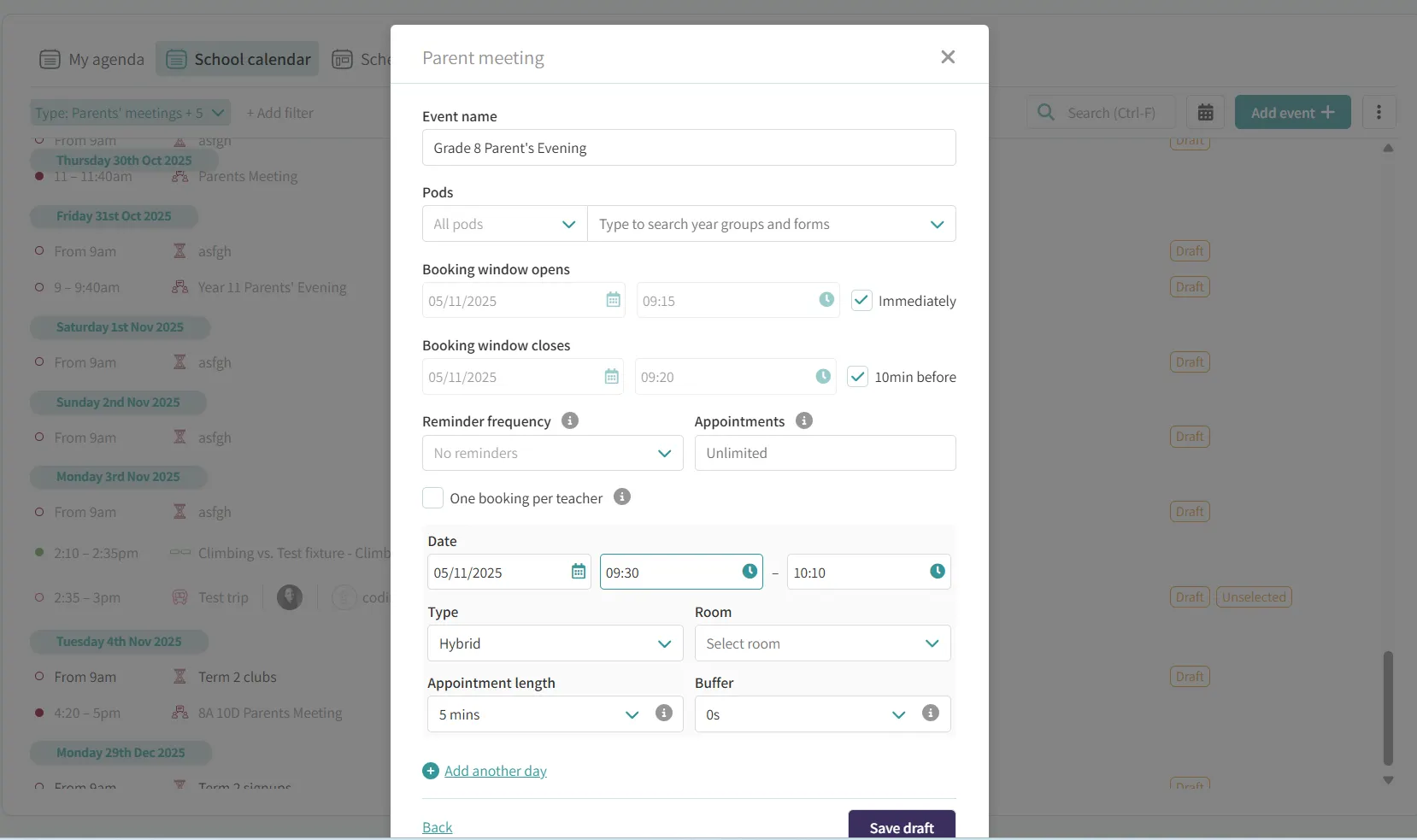 - If the “Reminder frequency” is selected for the event, Parents who have yet to book a slot with a teacher will be reminded as per the selected timeframe. They will also be reminded to book every day from 3 days before the booking window closes.