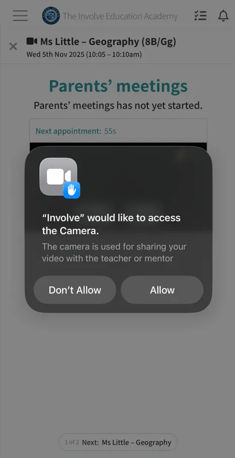 When joining via a browser or via the Involve App for the first time, the parent may need to select to enable permissions of the browser or app to the camera and/or microphone. Without these permissions set, the parent will not be able to use the video or the microphone.