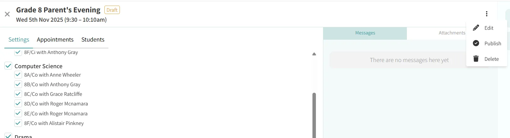 All the individual appointments the parents have booked for the teacher will be displayed.