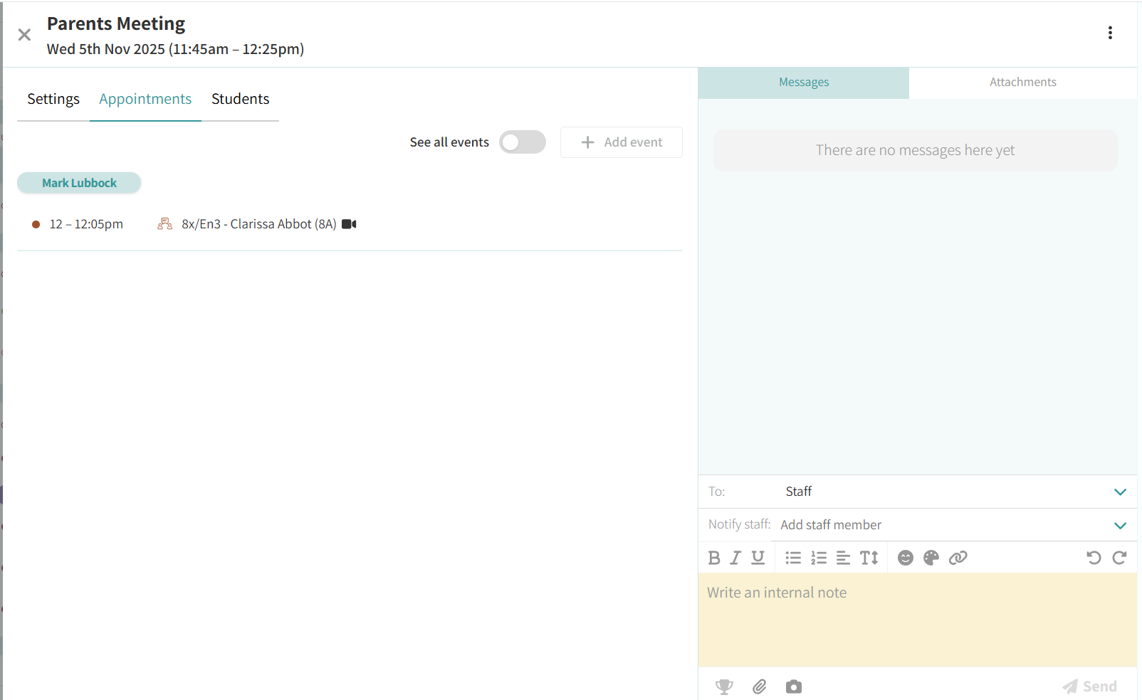 While you can select a break for all staff linked to the event, you can also add individual events (such as additional breaks, using the “Other Event” option) for staff within the meeting event for the Parents’ Meeting.