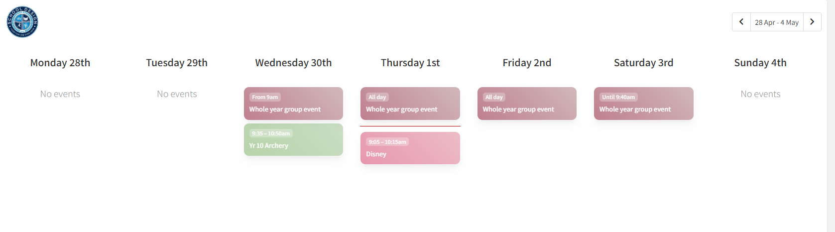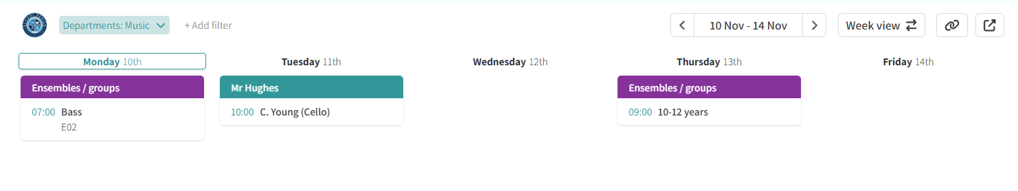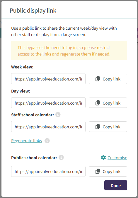 This will open a dialog, where you can copy the link to the Week view, Day view, Staff school calendar view (only shows the events which staff can see) or the Public school calendar view (this view excludes any events only visible to staff).