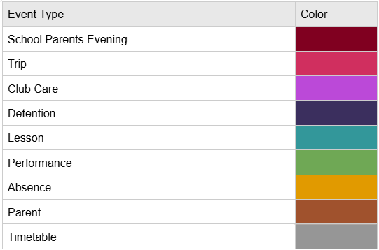 Parent and Student Calendar - Event Colour Mapping Guide Stuart White Updated 13 January 2026 15:30 When a parent views the calendar, events are displayed with different colours based on the event type. Related to Calendar
